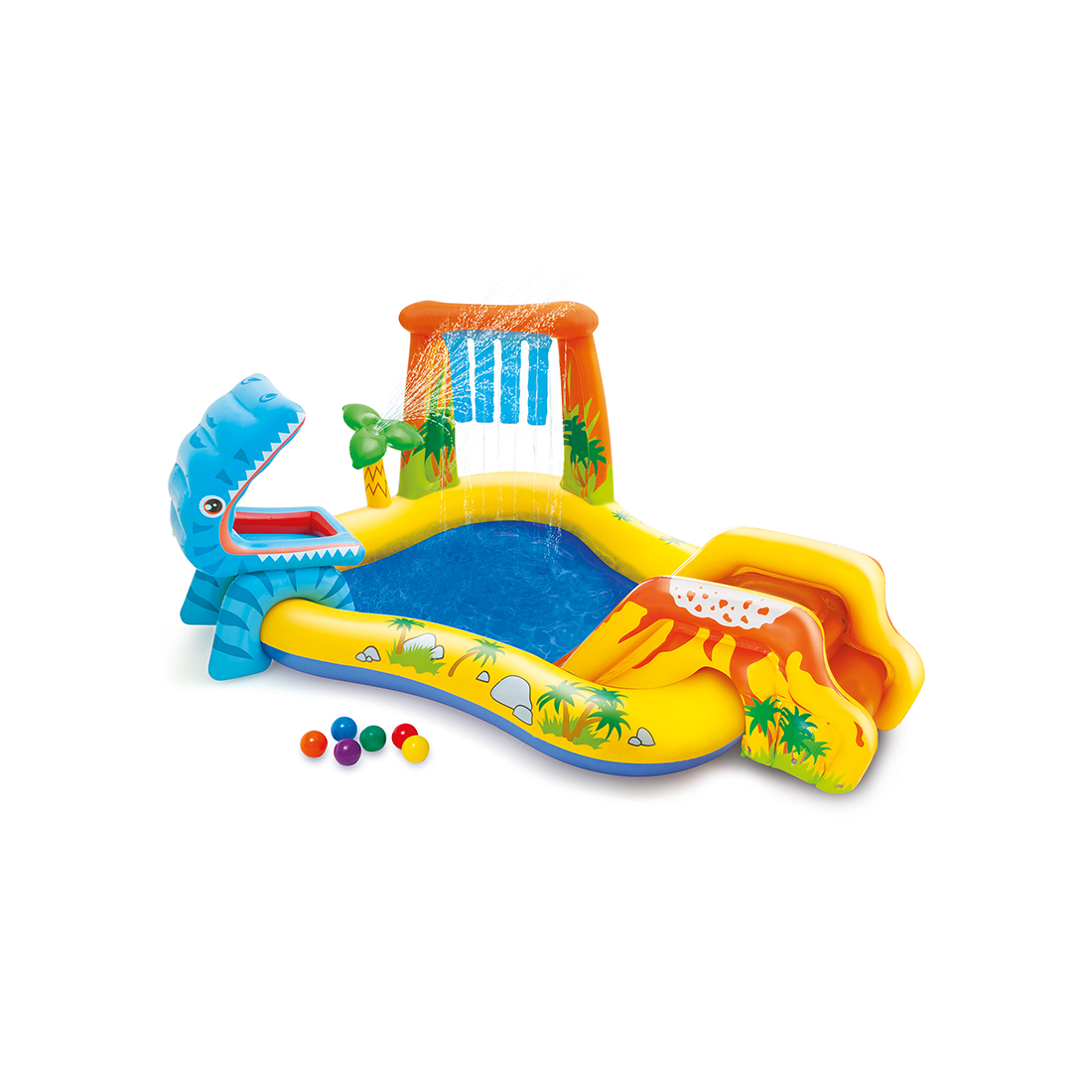 Детский надувной игровой бассейн Dinosaur 249 x 191 см, INTEX, 57444NP, Винил, 310 л., 2+, Встроенный разбрызгиватель, Надувная горка, Надувная голова динозавра, 6 шариков, Сливной клапан, Жёлтый, Цветная коробка