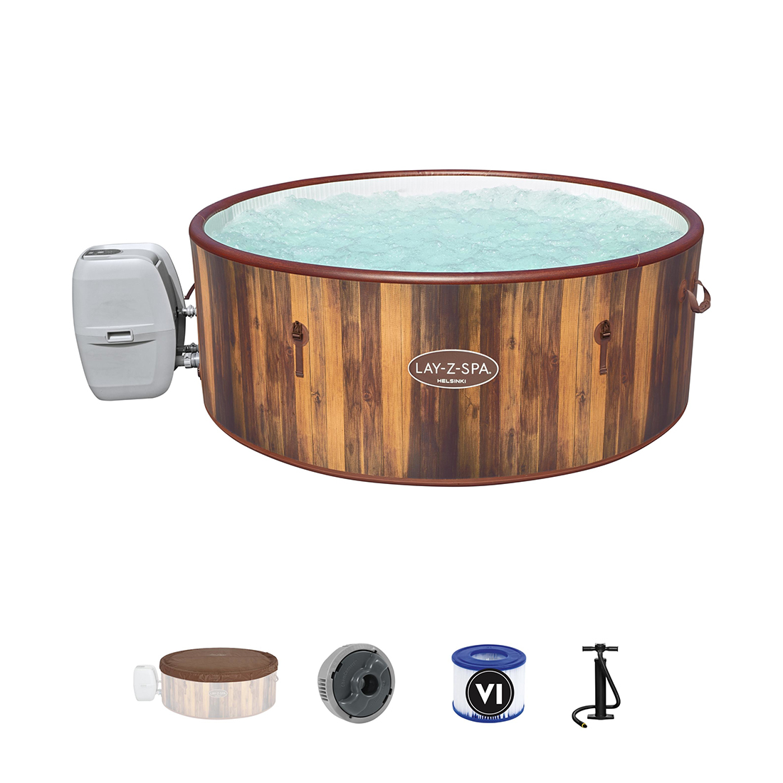 Надувной бассейн-спа Helsinki LAY-Z-SPA 180 x 66 см, BESTWAY, 60025, Винил, 1123 л., 5-7 человек, Система FreezeShield, Деревянный принт, Цветная коробка