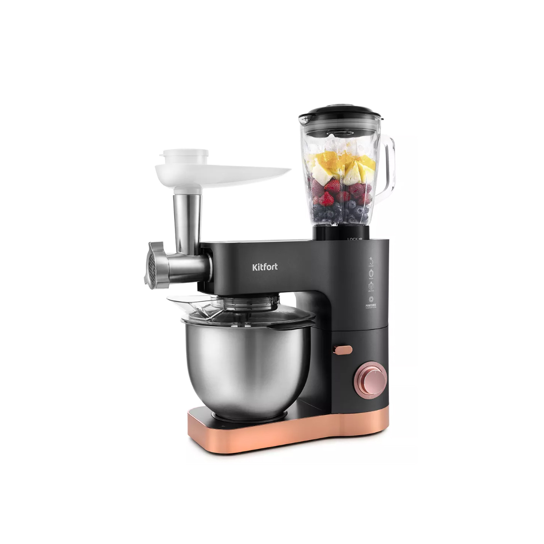 В комплекте миксера имеется блендер, мясорубка, тестораскатка и кофемолка, что превращает эту модель в универсальную кухонную машину «5 в 1».