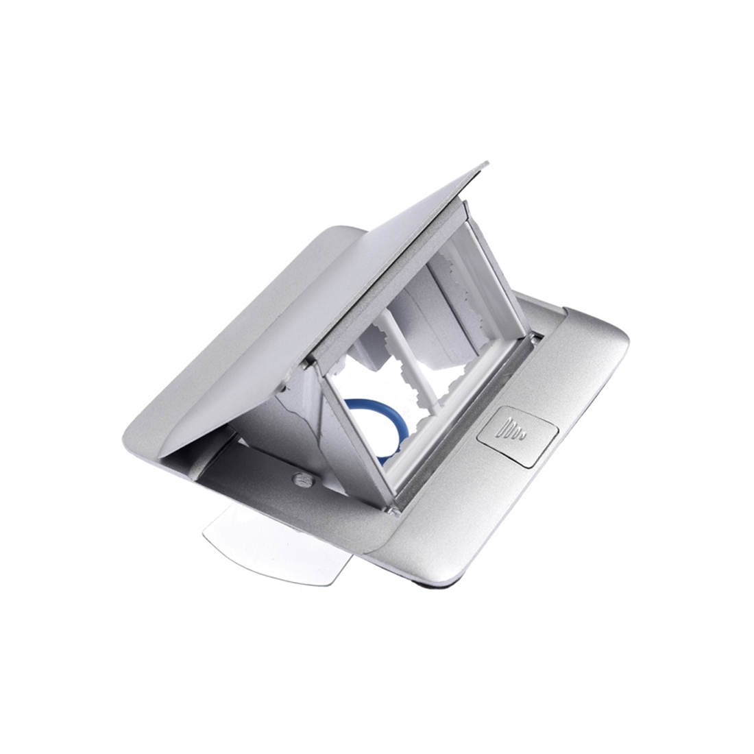 Корпус розеточного модуля изготовлен из качественного металла, а поверхность крышки имеет цвет алюминия (схожая по фактуре и цветовым характеристикам).