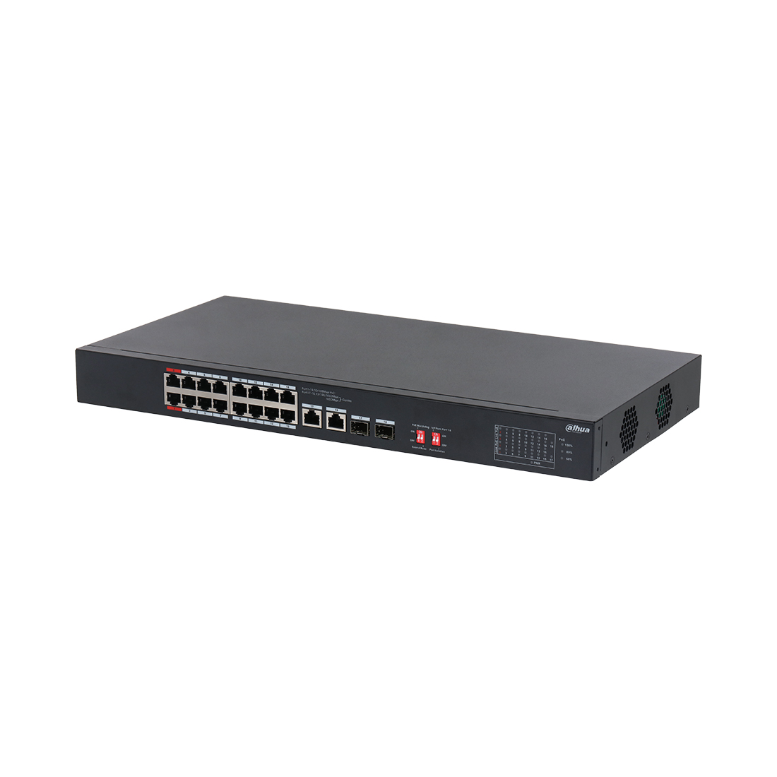 Коммутатор, Dahua, DH-S3218-16ET-135, Неуправляемый, 16 портов RJ-45 (10/100 Мбит/с, PoE), 2 порта RJ-45 (10/100/1000 Мбит/с, uplink, комбинированный), 2 порта SFP (1000 Мбит/с, uplink, комбинированный), 802.3af/at/bt порт 1 ~ 2: ≤90 Вт, порт 3 ~ 16: ≤30 Вт, общая: ≤135 Вт, стоечный