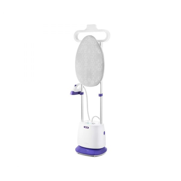 Вещи можно вешать на плечики, на обычную вешалку, подвешенную к отпаривателю, или разложить их на гладильной доске. Она сделана из материала, который пропускает пар и может быть установлена горизонтально или вертикально. Утюжок ставится на держатель.